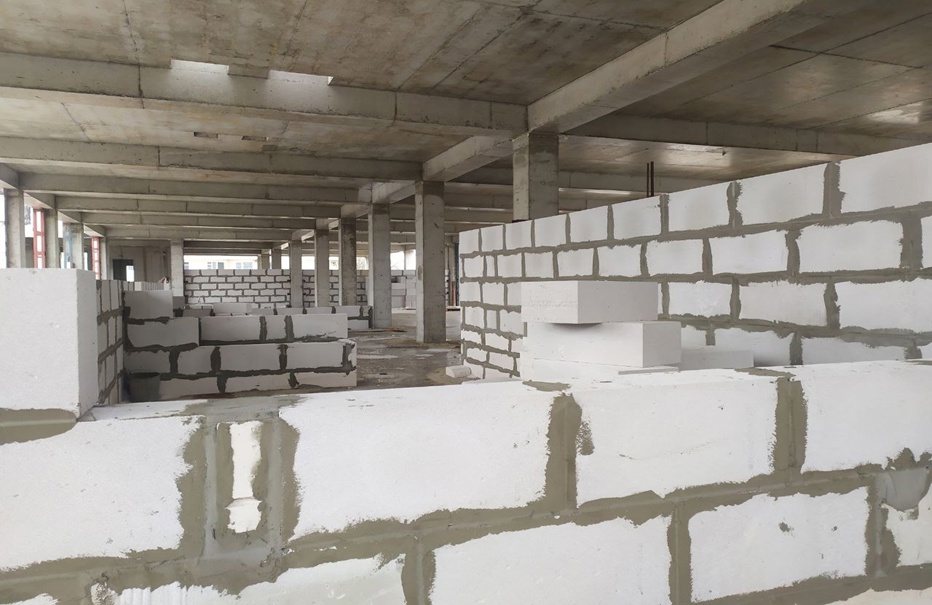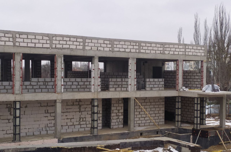 В настоящее время выполняются работы по устройству наружных стен и перегородок, входных групп, наружных лестниц, монтажу оконных блоков, обрамлению колонн.