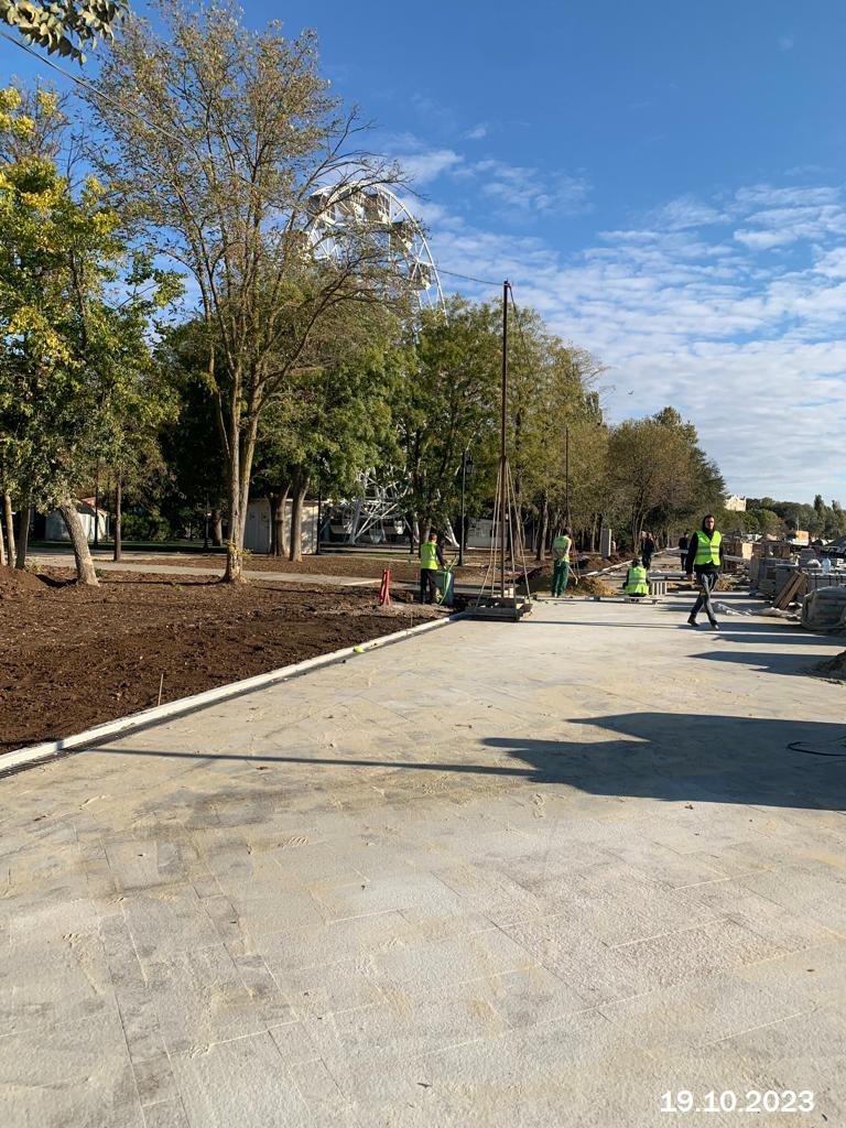 В настоящее время выполняются работы по отсыпке пляжного материала (галька), устройству покрытий тротуаров из гранитных плит и облицовке волноотбойного парапета гранитными плитами, а также монтаж детских площадок, пункта охраны, туалета и оборудования фонтана.
