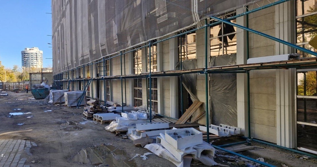 Сегодня на объекте монтируются системы отопления и вентиляции, профильная система витражей, витражные и дверные откосы. Также идёт устройство декоративной отделки стен колосниковых лестниц и каркаса подвесного потолка, устанавливаются дверные блоки.