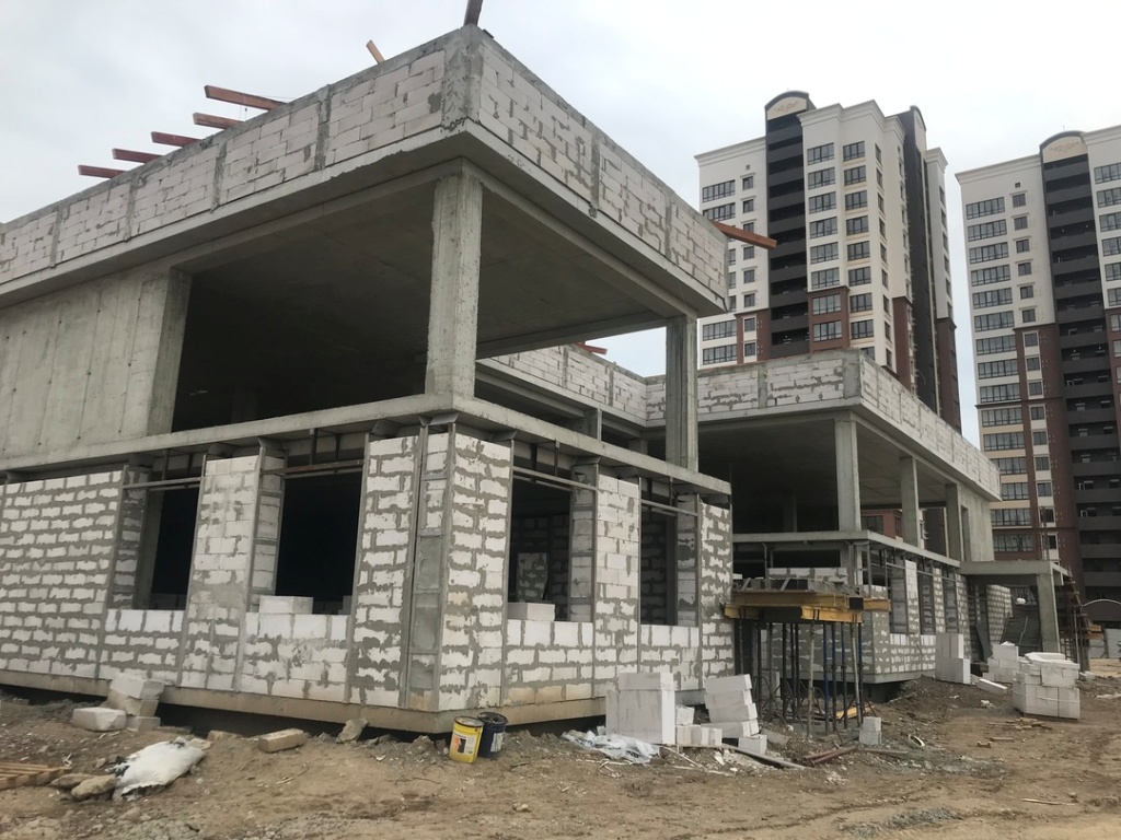 В данное время в детском саду на 280 мест завершены работы по устройству монолитного каркаса здания, выполняются работы по кладке наружных и внутренних стен первого этажа, выполняется монтаж металлоконструкций второго этажа для дальнейшей кладки из газобетона. По всему зданию прокладываются инженерные коммуникации.