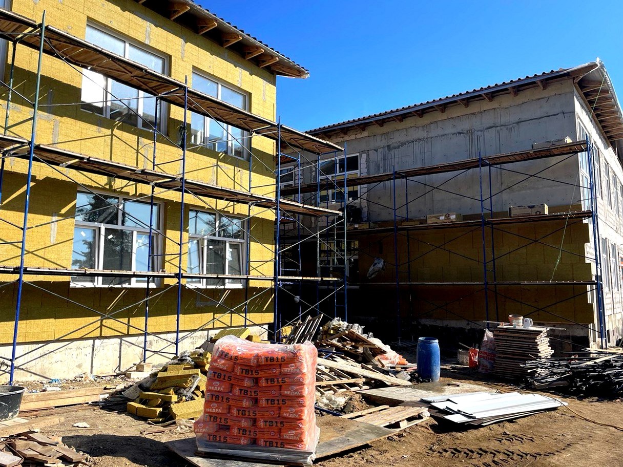 Сегодня рабочие заканчивают установку кровли и монтаж конька, занимаются изготовлением вентиляционных шахт и устройством профлиста на 2 блоке кровли. Монтируют опалубки стен лестницы к спортивной площадке, шпаклюют стены, откосы, ригели и колонны. На 1 и 2 этажах проводятся системы вентиляции, водопровода, канализации и отопления. Завершена укладка плитки на стены в пищеблоке и прачечной.