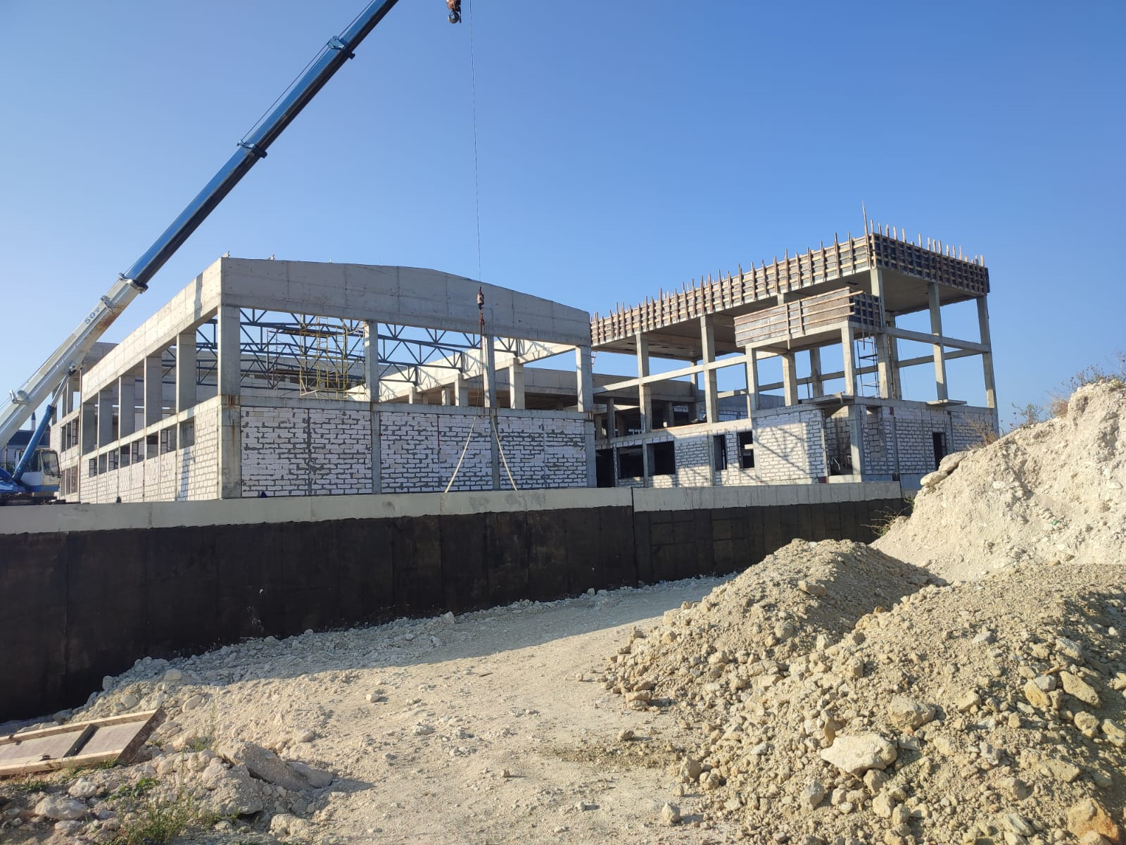 В настоящее время выполняется кладка стен из газоблока и кирпича, монтаж вентиляции и наружной системы пожаротушения, обратная засыпка грунта пазух подпорных стен.