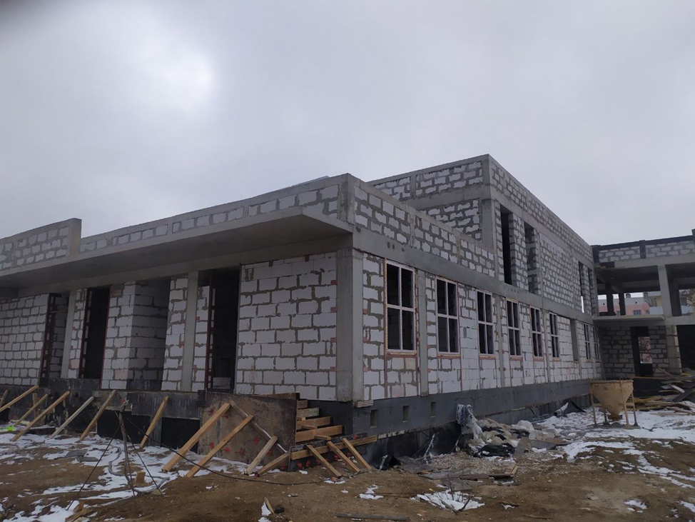 В настоящее время выполняются работы по устройству наружных стен и перегородок, входных групп, наружных лестниц, монтажу оконных блоков, обрамлению колонн.