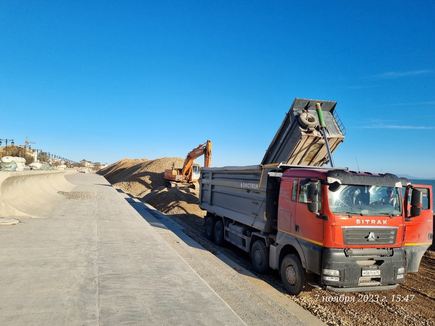 В настоящее время выполняются работы по отсыпке пляжного материала (галька), устройству покрытий тротуаров из гранитных плит и облицовке волноотбойного парапета гранитными плитами, а также монтаж детских площадок, пункта охраны, туалета и оборудования фонтана.