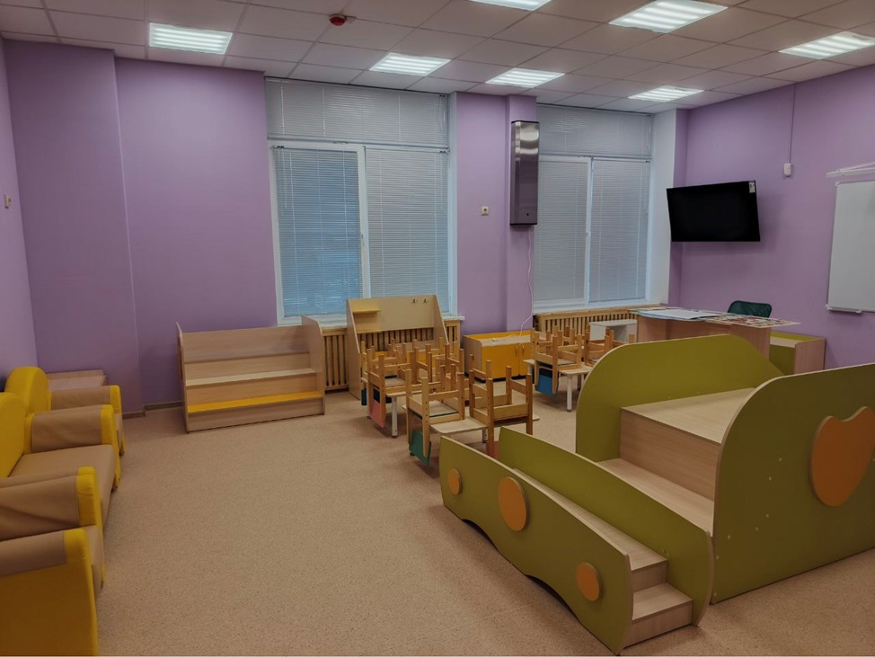 Детские площадки на территории выполнены из травмбезопасного покрытия. Детские площадки оснащены малыми архитектурными формами для активных игр на свежем воздухе. Территория ограждена по периметру забором и видеонаблюдением, что препятствует доступу на территорию посторонних лиц. Выполнены мероприятия по обеспечению доступа для инвалидов.